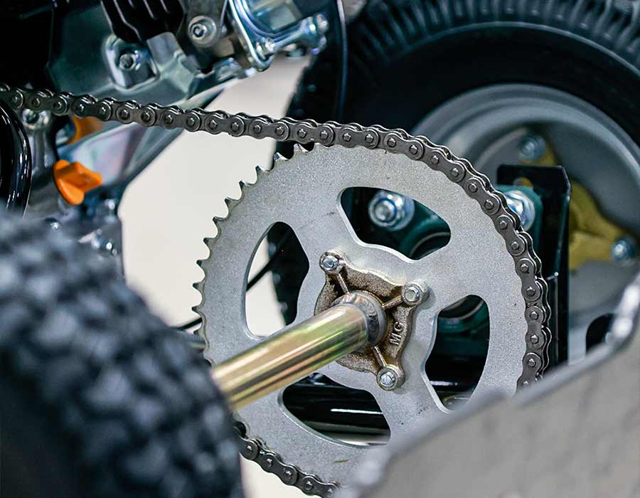 It performs well on grass, dirt, concrete, and asphalt, thanks to the 6-inch turf tires and high-torque chain drive.